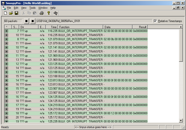 Note: I have also tested HHD USB Monitor, which is highly recommended and appears to be used by Microsoft judging from some of the screenshots in one of their powerpoint presentations on USB, and while it does format the data better and can give more background information on a device, it does not perform significantly better than SnoopyPro for my purposes, and more importantly neither can tell you about the USB traffic of a device which didn't enumerate (at least partially). So while I have the demonstration version of HHD installed, I feel that SnoopyPro is enough — and it's open source!